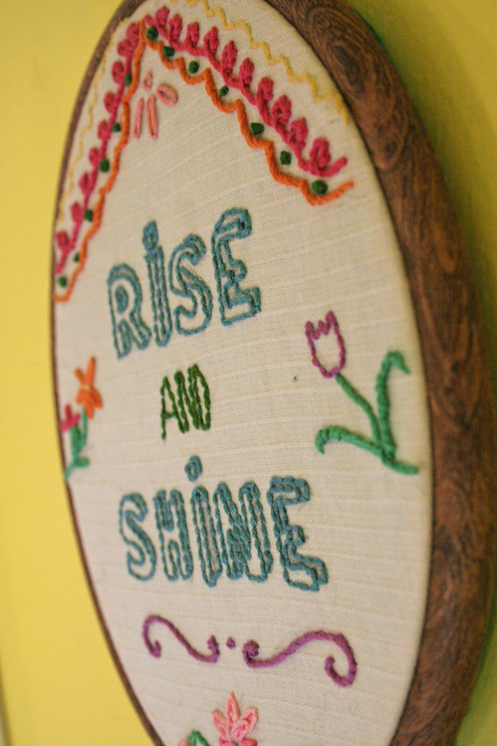 Hand stitched on linen using an assortment of bright colors to help your day start off on the right foot. It'll be sure to put a pep in your step.