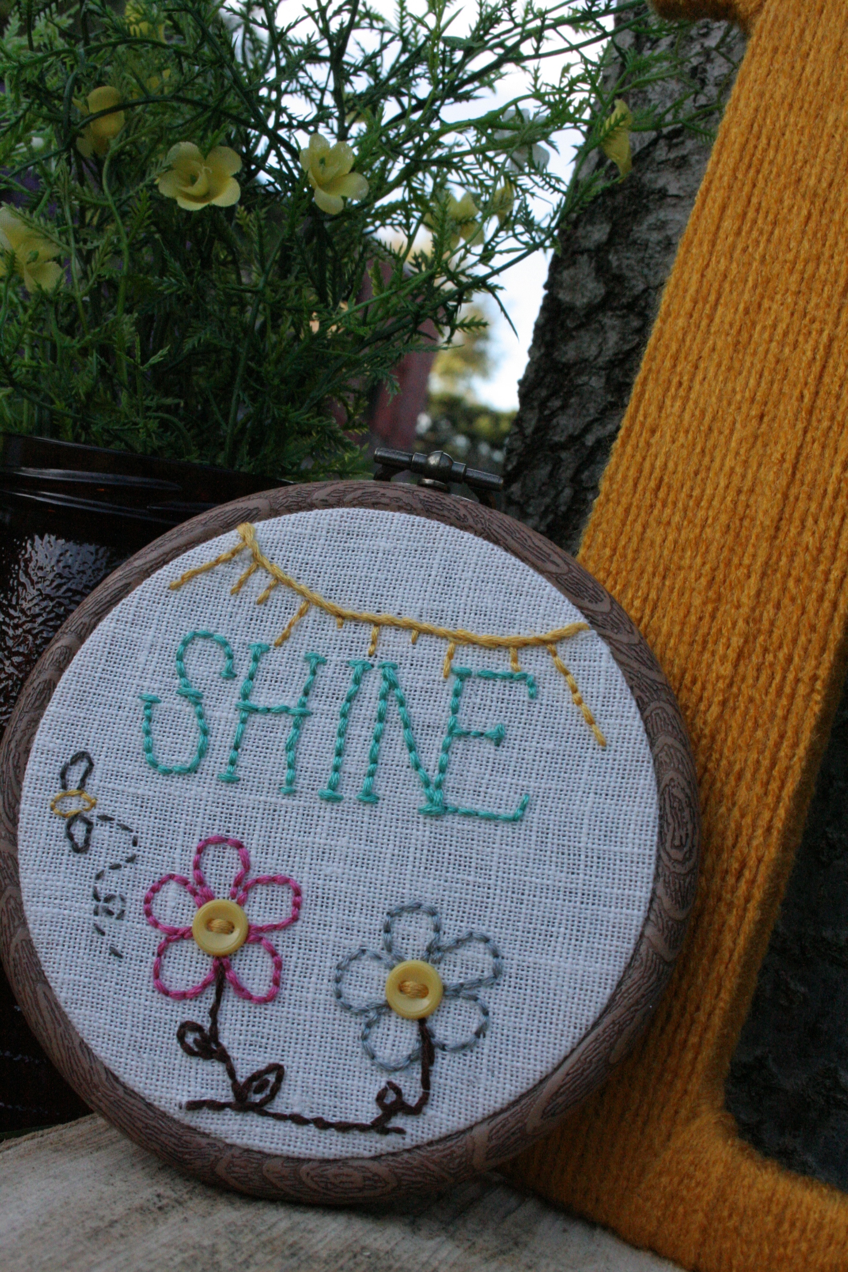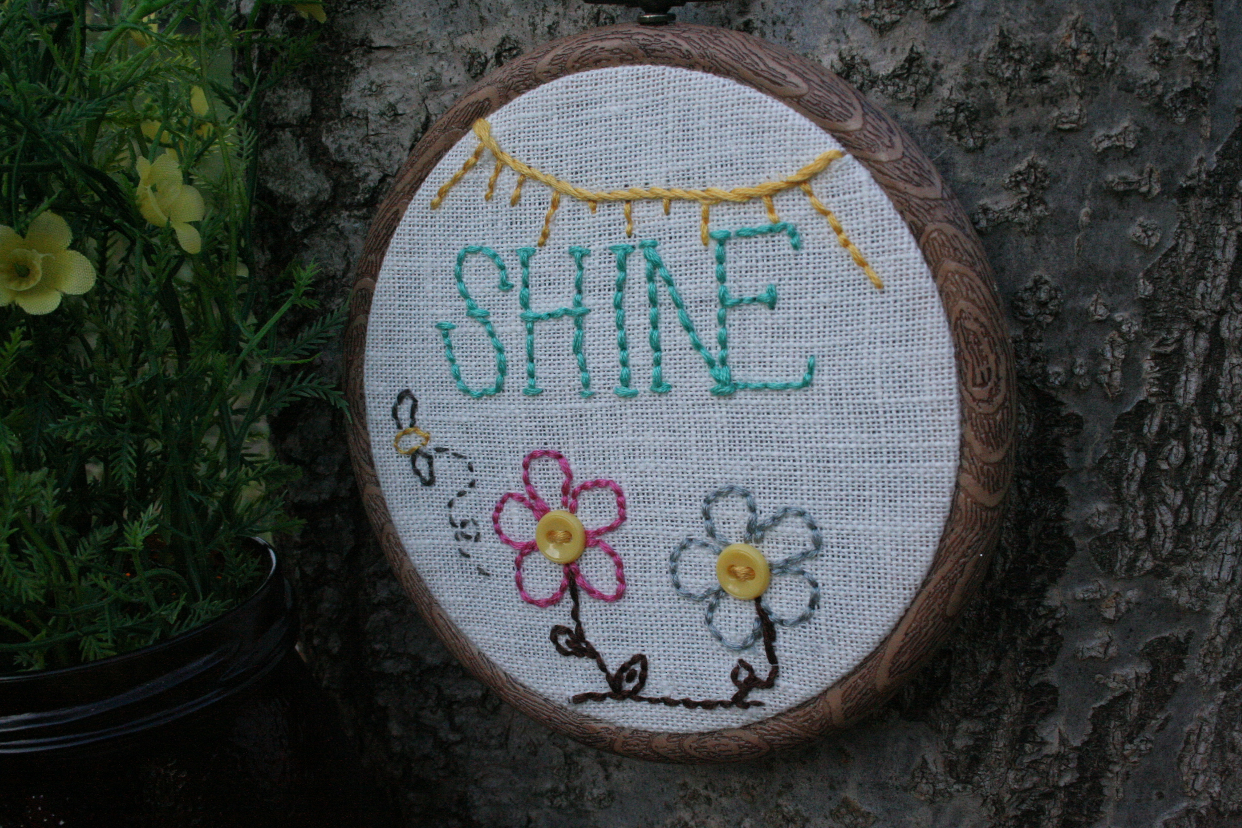 This piece will be a daily reminder of how you shined your goodness towards making a difference in someone else's life. Hand stitched on linen and accented with vintage fabric and vintage buttons. Displayed in a 4" faux wood grain hoop