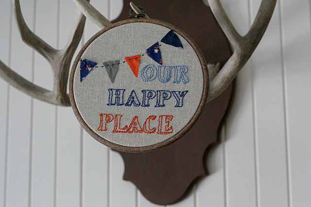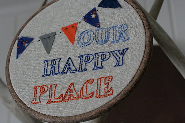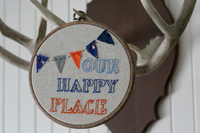 Hand embroidered on quality linen and displayed in a 7" Faux wood grain hoop. The bunting is all made from vintage trims and materials