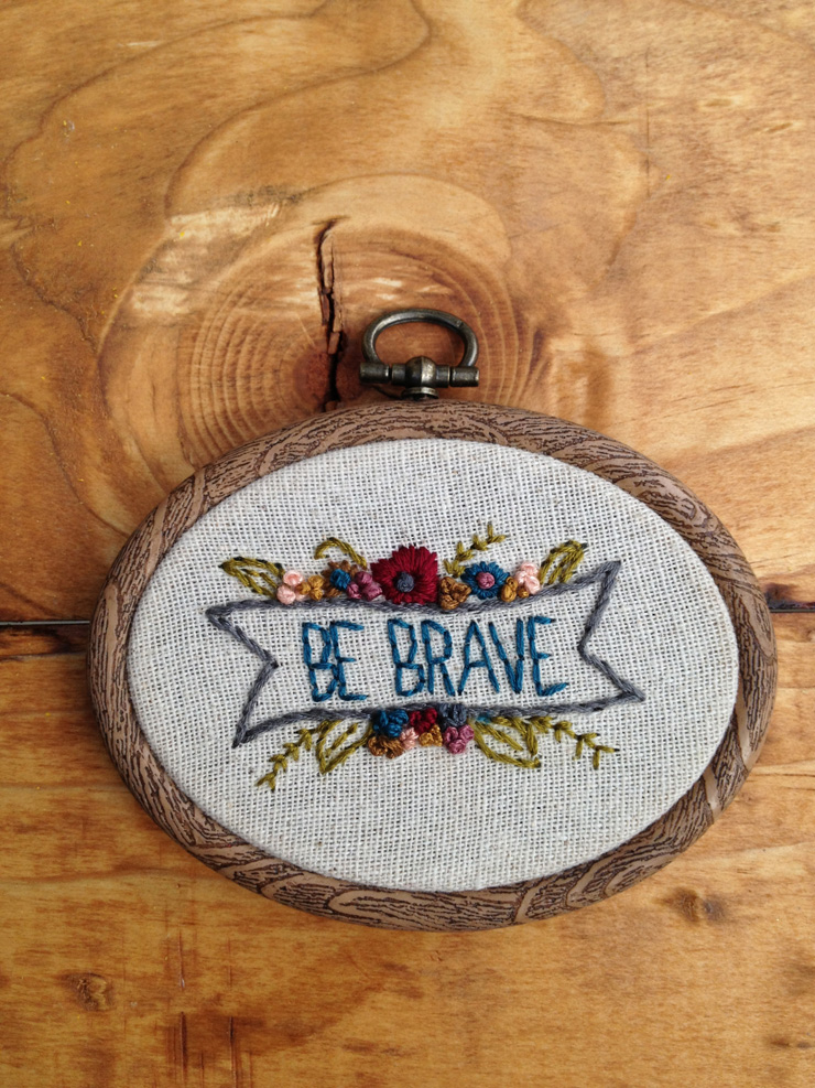 Hand-stitched on quality linen and display ready in a 2" x 3" faux wood grain hoop.