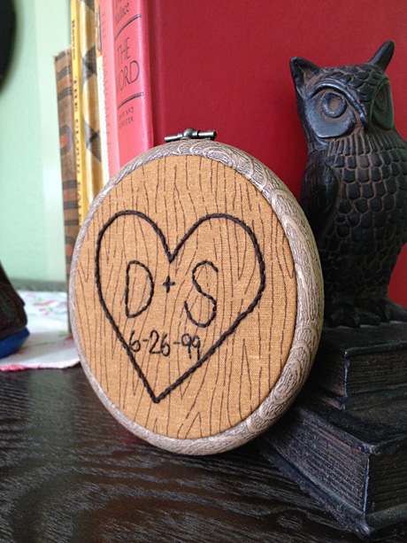 Hand Stitched with love on tree trunk printed cotton linen. Display ready in a 4" faux wood grain hoop.