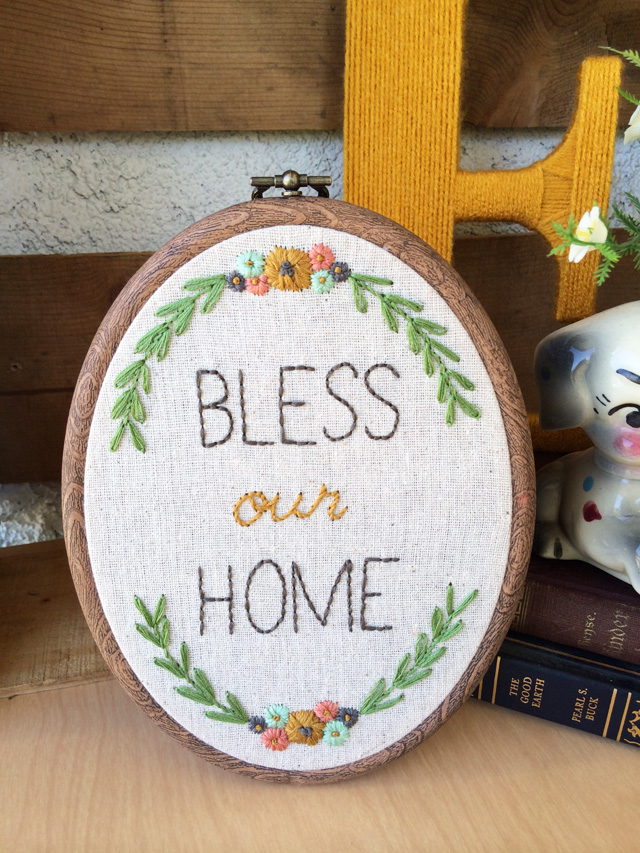 Hand stitched on high quality cotton linen and is display ready in a 7" round faux wood grain hoop.