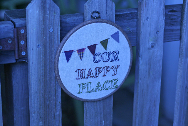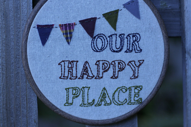 Hand embroidered on quality linen and displayed in a 7" Faux wood grain hoop. The bunting is all made from vintage trims and materials